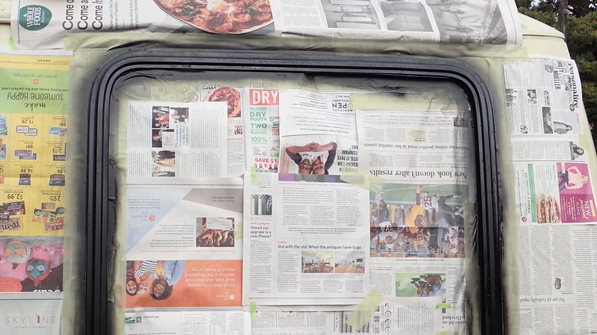 We lightly sanded the frames and wiped them down with rubbing alcohol. After investing in a Sunday newspaper (who knew they were still in print??) we generously framed the window with yards of painters tape and paper. All this paper may have been overkill but we wanted to be sure there was no overspray.