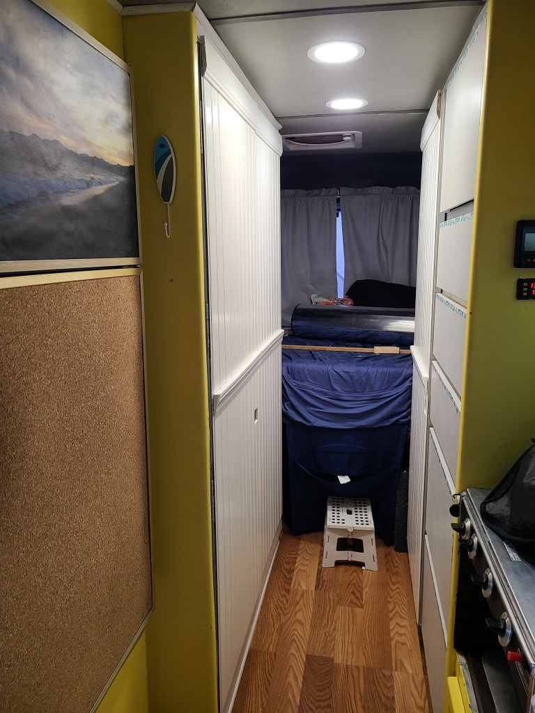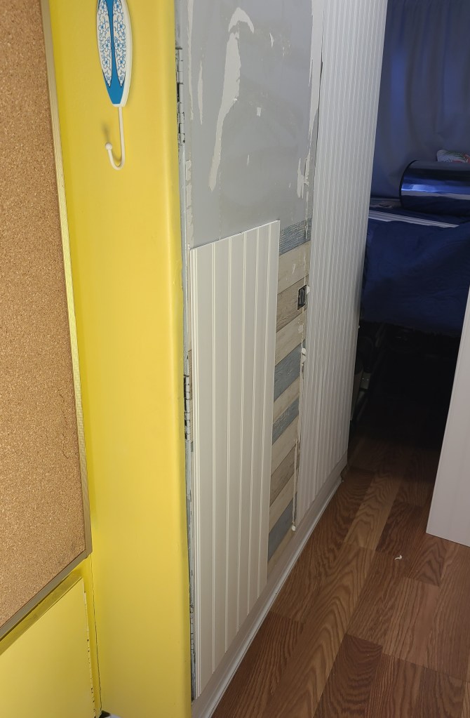 We also redid the hallway this weekend. It’s a narrow area so the walls are easily scuffed up. A few weeks ago, I tried a bead board type wallpaper but it didn’t stick like it should (sometimes thrifty doesn’t pay off!). We decided to get the same bead board we used in the living area and apply it to the outside of bathroom door, the wall and the closet door. The ceiling lights reflect on the walls which adds so much more brightness. We installed a ‘chair rail’ to cover where the boards meet and ‘ceiling molding’ to cover the rough cut edges. I know some people want everything to stay original to the 1975 GMC Motorhome but I have to say I like how so many of us are making the interiors our own. I love the hint of beach cabana for our interior, it makes me smile.