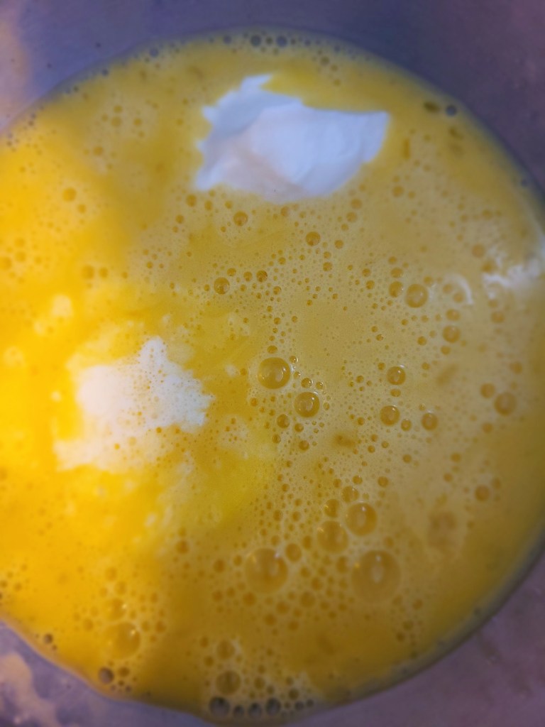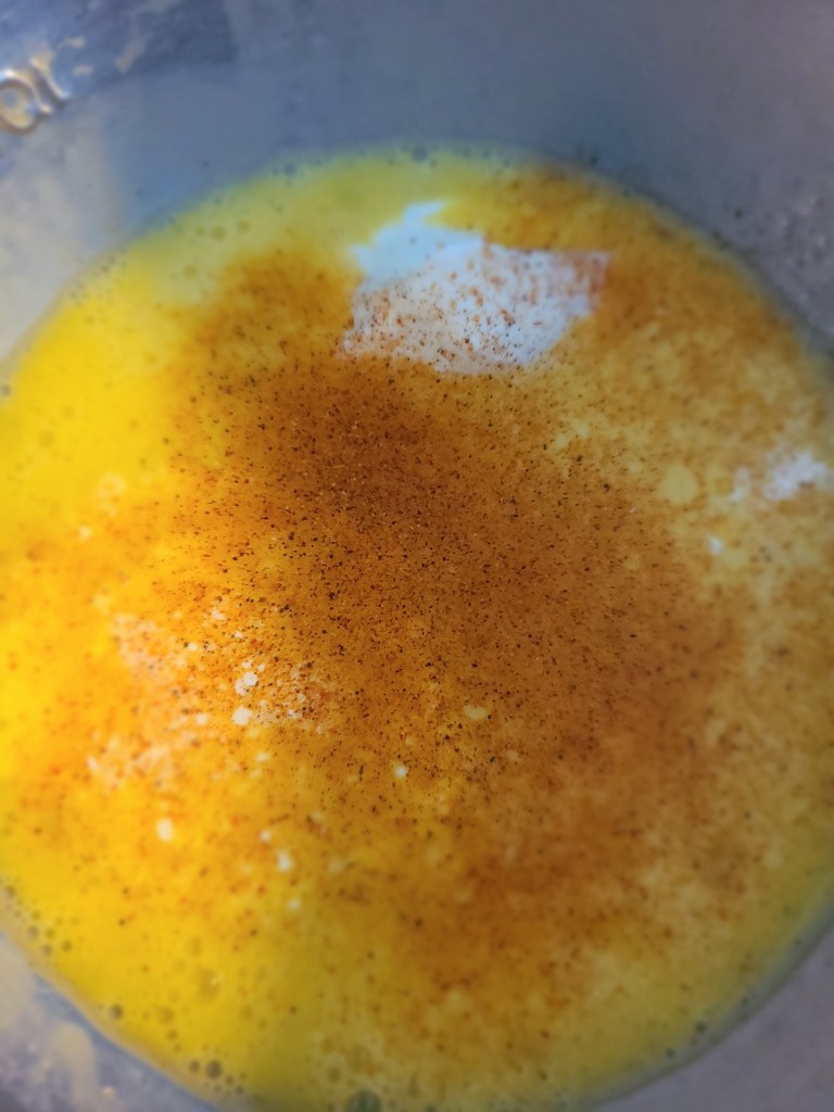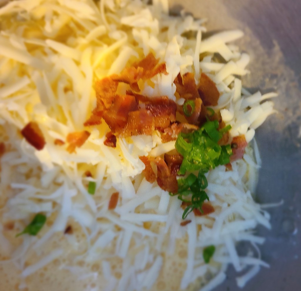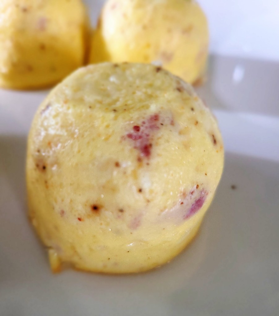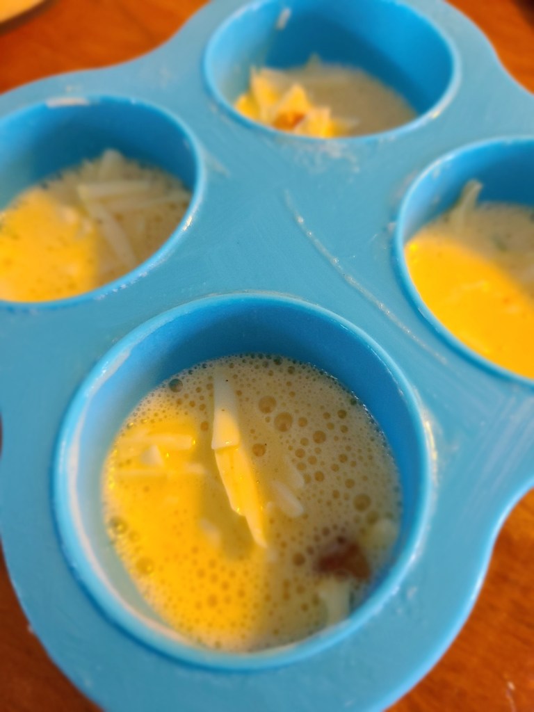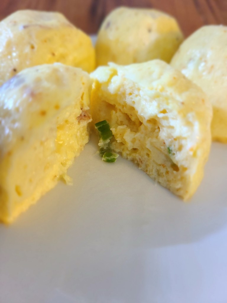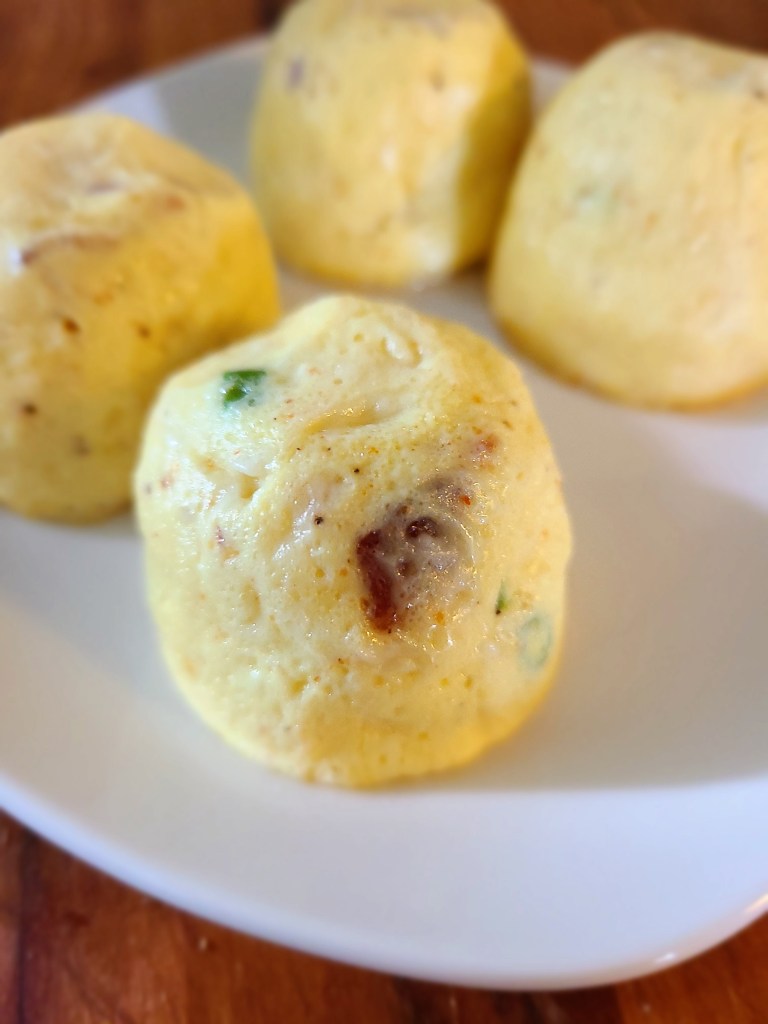 I thought it was a little silly that some insist you use a blender or immersion stick to blend your eggs when a whisk or a fork works just as well. I beat four whole eggs then added a dollop of sour cream and a drop of heavy cream – things we always have in the fridge – and added a shake or two my favorite seasoning, Tony Chachere’s. Then I whisked in some white cheddar cheese, half a slice of diced crispy cooked bacon and a few green onion ends/scallions. I did take into consideration the advice from one recipe to use a measuring cup to pour into the silicone mold to make it easier, though was a little stubborn and learned they were right after the first batch that filling only 2/3 full works best as the eggs will expand. I was glad my mold came with a silicone lid so didn’t have to cut aluminum foil or parchment paper to cover the egg mixture so the steam from cooking didn’t get into the eggs.