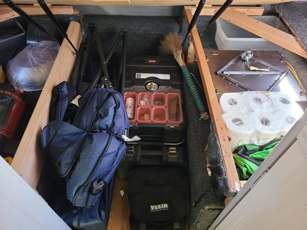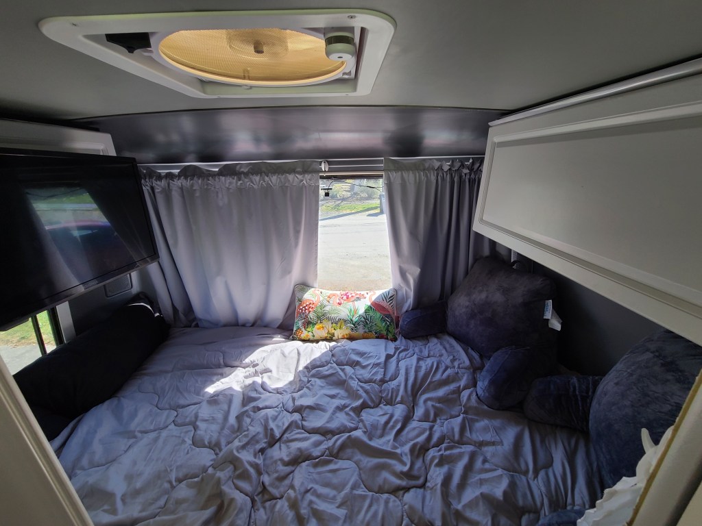 While I have written many previous posts going over most of the restomods and replacements we’ve done in detail, for the next few weeks I will be writing about some of the updates/modifications we’ve done lately. Although we haven’t been able to go out as often as we’d hoped, what with travel restrictions and we have limited vacation hours, we are learning what we thought would be perfect could use some tweaking – or completely changed all together. This week I am going to focus on the bedroom. What started as a sitting room is now a full-size bed with a cozy mattress, sumptuous pillows and ample storage underneath in addition to the original cabinets. We have a small smart tv that is attached to the front of one of the cabinets and the remotes for the fan and tv are attached by Velcro above our heads under the other cabinet. Under the bed we have two camping chairs, our Blackstone Grill, tool boxes and bags, gizmos and gadgets and there is room for more. There is no basement (outdoor) storage so creating space was a must. We have the Quickzip sheets that made removing the sheet for washing so easy – you can see the bed is wall to wall so making the bed is a work out. We left storage at the foot of the bed for spare blankets, pillows and there is room for more. I found a bag to hang with command hooks on the wall to hold phones and a book or any other ‘nightstand’ items, it’s actually a bath toy organizer – you have to think out of the box sometimes for some of these ‘modifications’. The photo of the bedroom isn’t the greatest shot, but you get the gist of it.