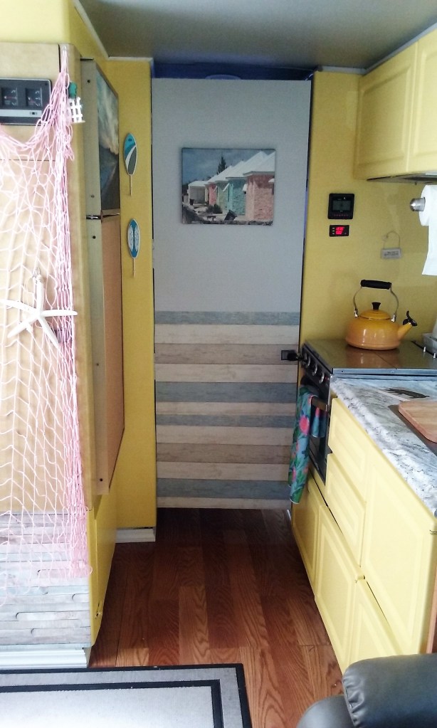 Many people choose to leave the GMC stock and keep the look of the 70’s which I can appreciate. Everyone has their opinion of the right and wrong way to do it and it can be a pretty vocal group when you want to do your own thing. I knew I wanted our GMC to be a surprise when you opened the door – the outside giving the illusion of the EM50 Project but the inside would feel like a vacation at the beach. Our Caribbean vacations have always given us joy and living in a beach cabana isn’t a bad fantasy to have! It was fun to go overboard with pink fishing line and puka shell bracelets to use as curtain holders. I knew the pink fishing line would eventually go because moving it every time I opened the pantry was annoying, but the small touches of items we bought as holiday ornaments from tropical travels throughout the home make me happy. So what started as purposely a bit garish is now a warm and bright place for us to hang our hats.