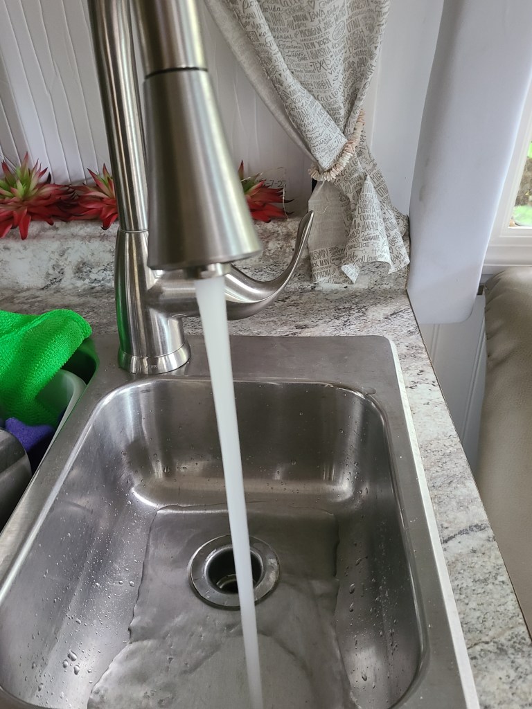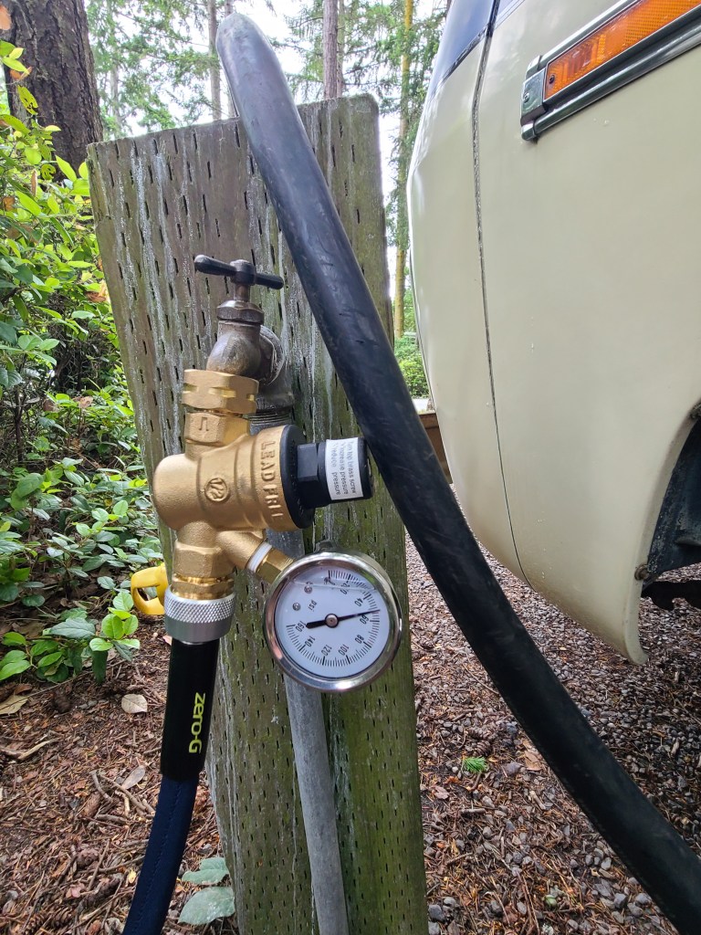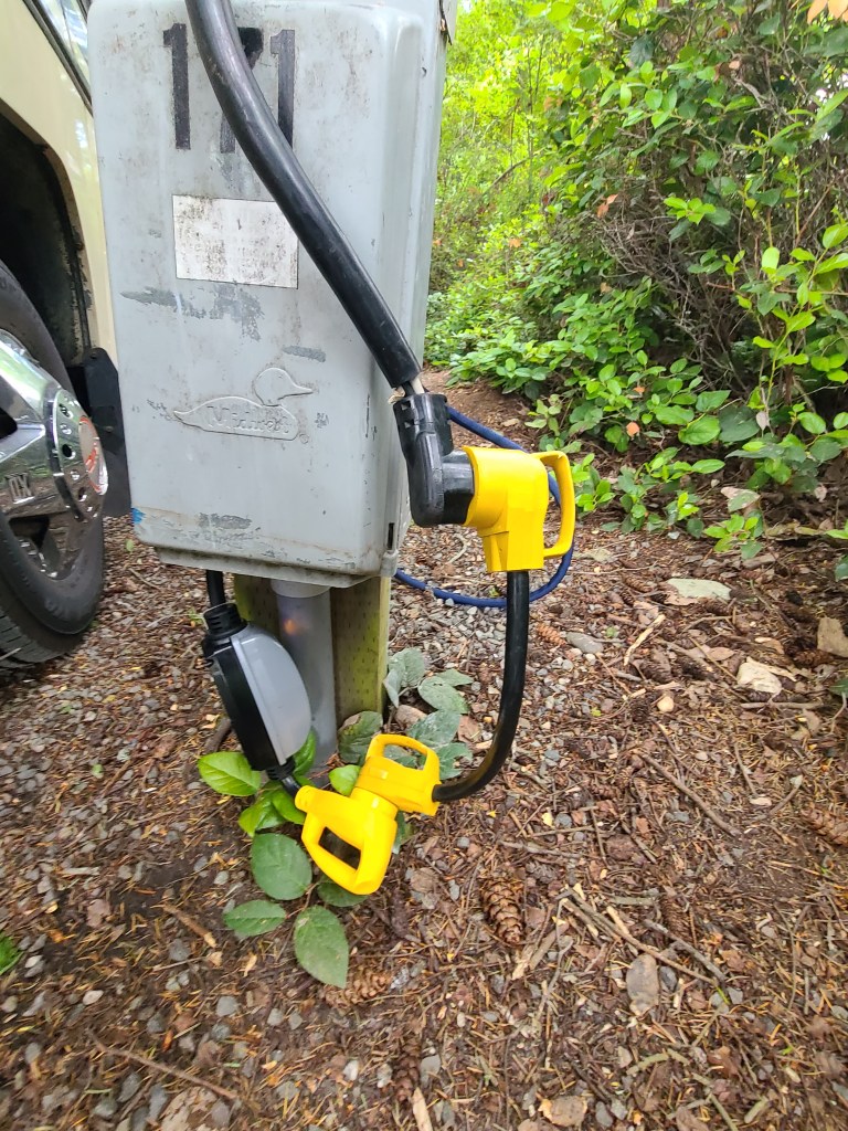 This was our first trip in which we had electric and water hook ups. The surge protector, along with the dog bone adapter so our 50 amp motorhome could use a 30 amp power box, gave us a sense of security. We even remembered to plug the surge protector in first then turn on the fuse to test the power before plugging in the motorhome itself! We had preset the water pressure regulator valve before we left home so when we hooked it up it was raring to go and we didn’t have to worry about blowing our water line. The tankless water heater we installed gave us instant hot water for showers and washing dishes.