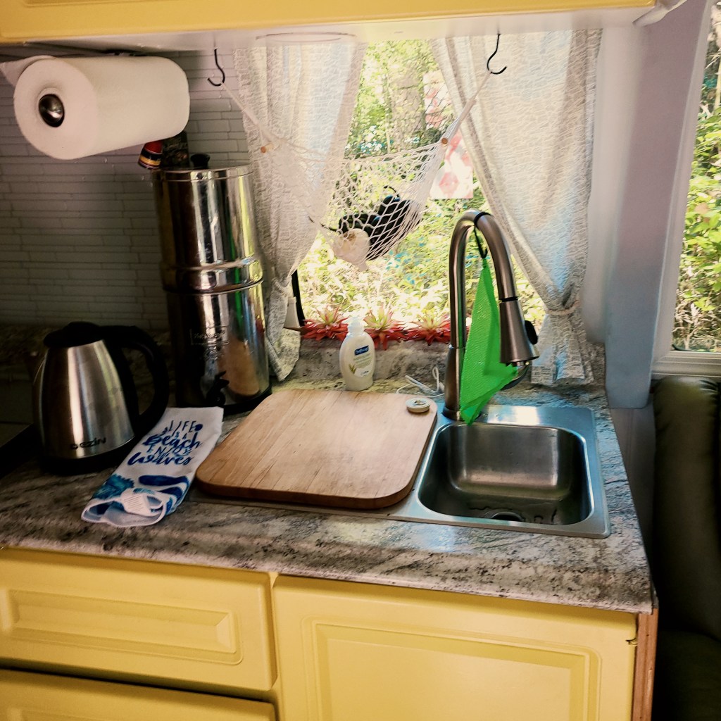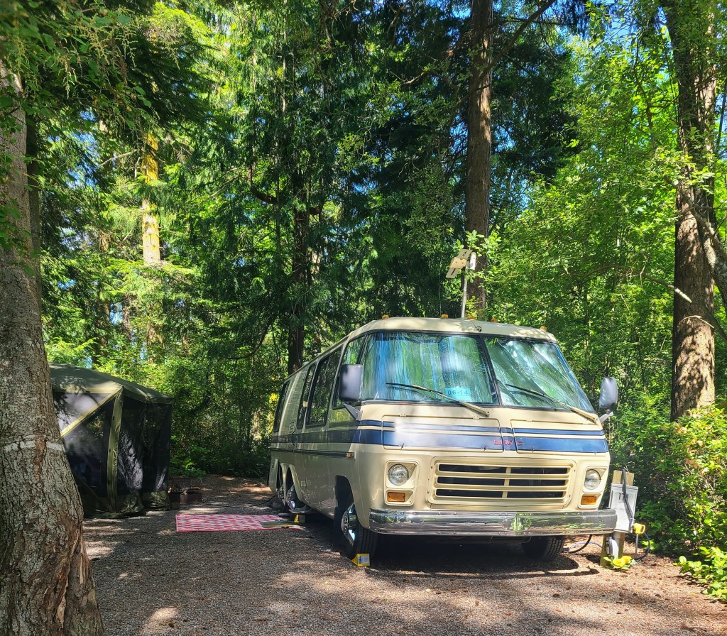 GMC made 1,196 of the 1975 GMC Motorhome Eleganza 2’s and we’ve spent a few years making ours uniquely our own. Our ‘beach cabana on wheels’ was our home this past week, and not only did she run great (even in the 20 minutes stopped in traffic as we returned to Seattle), every modification we made was a success. I think I was as happy about the fact we had the Berkey Water Filter system and the Clam Quickset Shelter as I was about getting away and being on vacation. The Berkey frees up room in the limited storage spaces because we don’t have to bring bottled water. The Clam shelter gave us 136 extra square feet of living space. These made going small but living large a lot more comfortable.