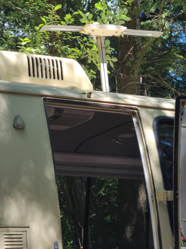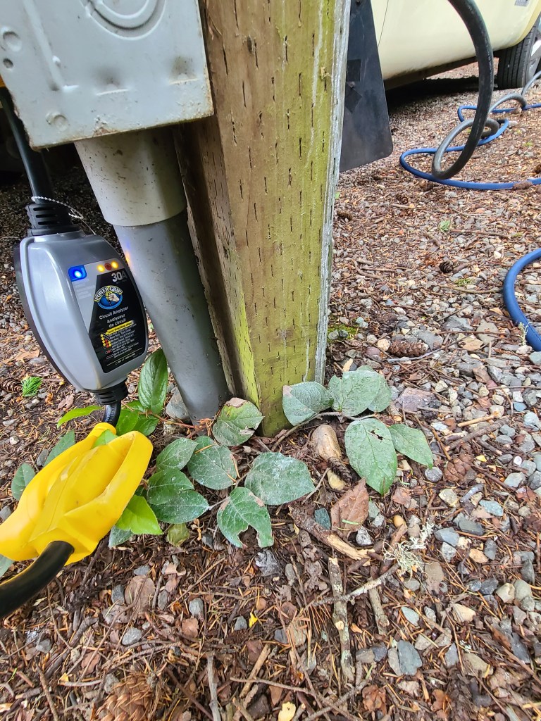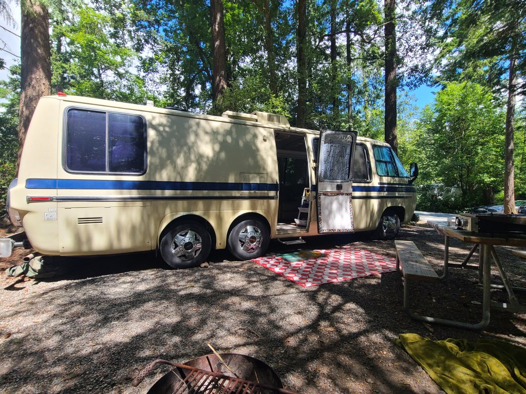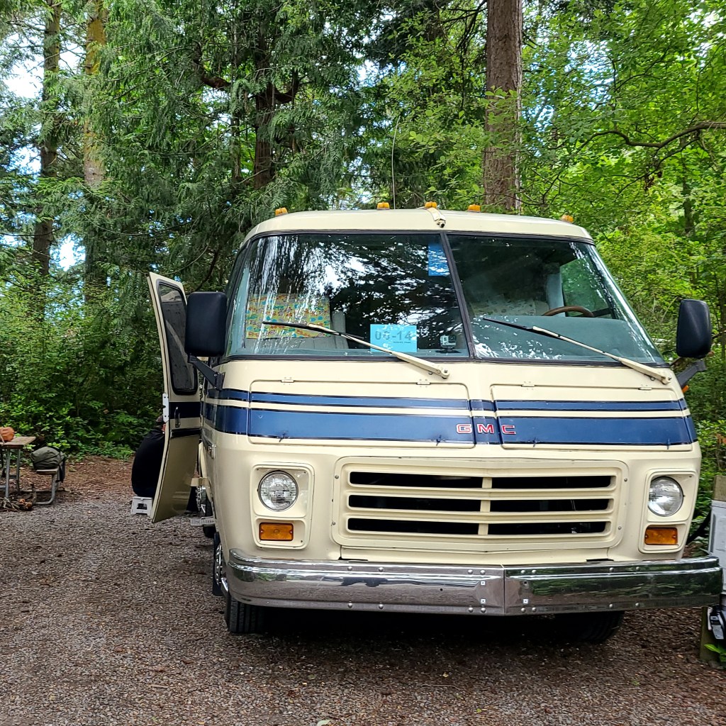 A major advantage of a 26 feet long motorhome is the ease of backing in and parking. The sites are somewhat small and not 100% level but with our 1975 GMC Motorhome we had no issue backing in and lining up with the electric and water services. These sites remind us how we glad to not have slides to fuss with – once she is parked, she is ready to to be lived in. This was the first time we’d had electric and water hook ups at a campsite and we were able to use our electric adapter for the 30 amp service along with the surge protector and the water pressure regulator. We had preset the regulator before we left home, so one less thing to fuss with when we were hooking up.
