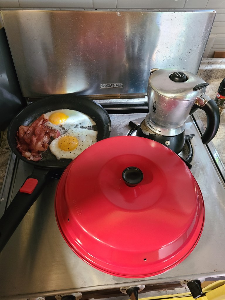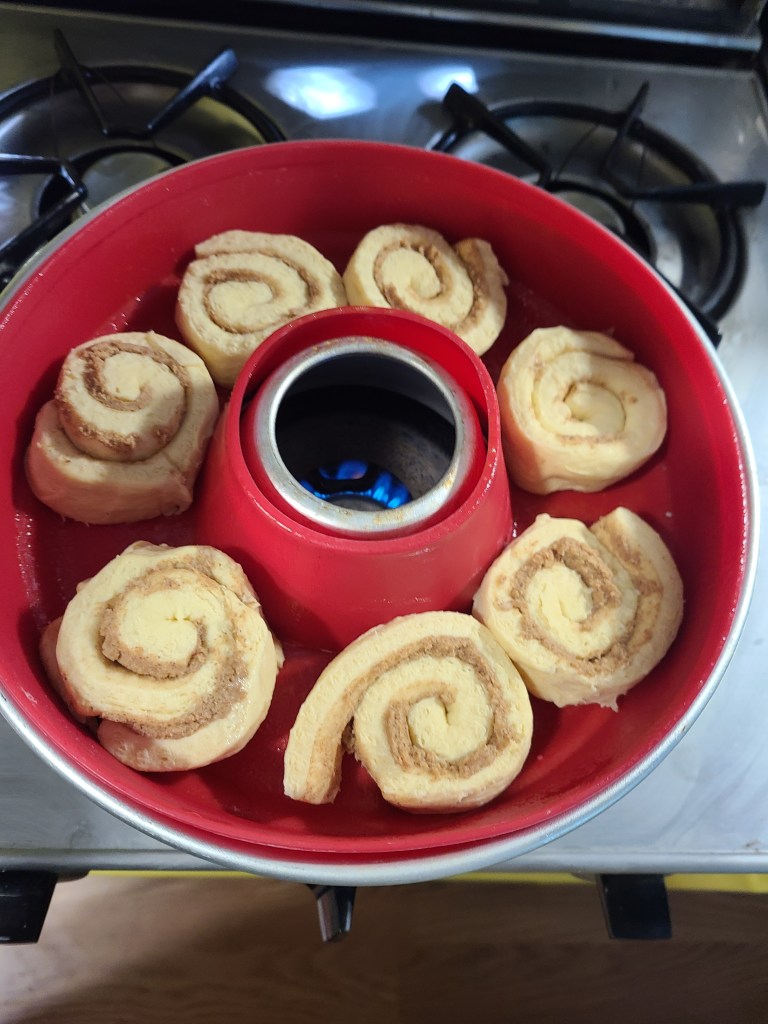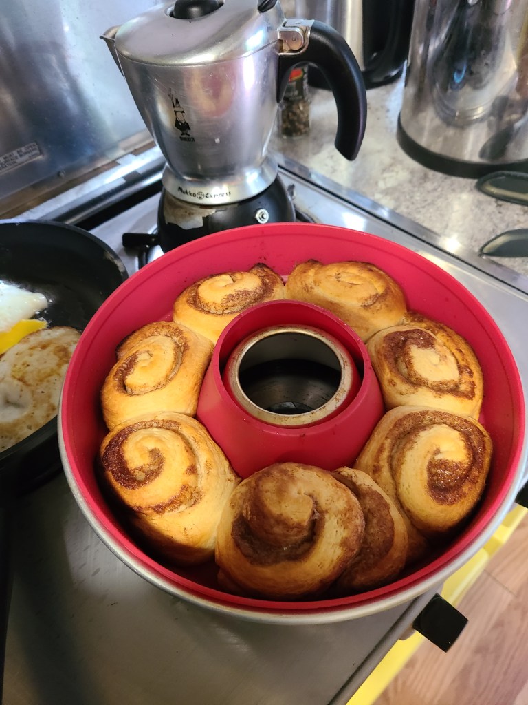 We had an amazing breakfast of hot cinnamon rolls plus eggs, bacon and coffee that we cooked on the propane stove top. Using the silicone liner for the rolls kept them from sticking to the pan. ‘Baking’ is a breeze, I didn’t set a timer but when it started to smell like baked bread I peeked under the lid and the rolls were done. The Omnia Stovetop Oven cooks directly over the gas burner, it takes up virtually no space when storing and works great.
