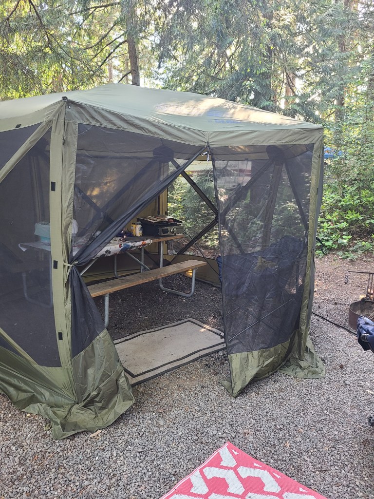 Our recent week in the 1975 GMC Eleganza 2 motorhome was certainly enhanced by some of the ‘extras’ we have added. We are very happy to have our Clam Quick-Set Escape ‘tent’, which gives us an additional room. This became our kitchen and dining area along with a space to read, play the ukulele and escape the mosquitos! As long as you watch one of the many set up videos, it really takes less then one minute to pop up, but if you overthink it can take much longer!