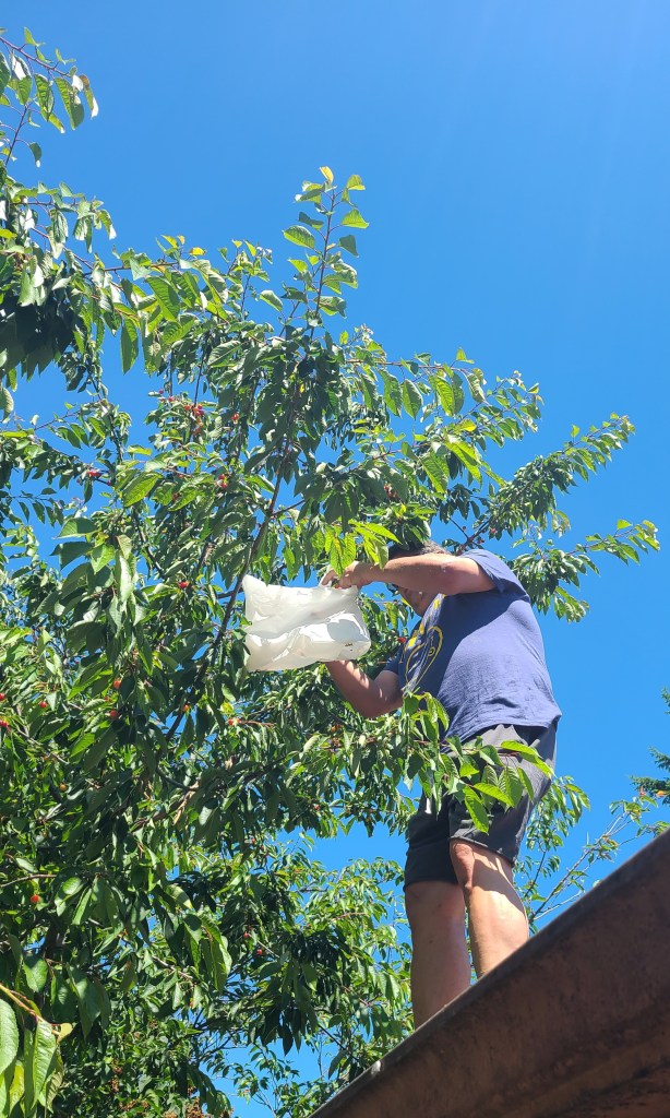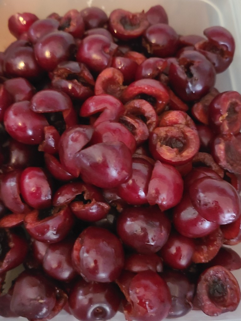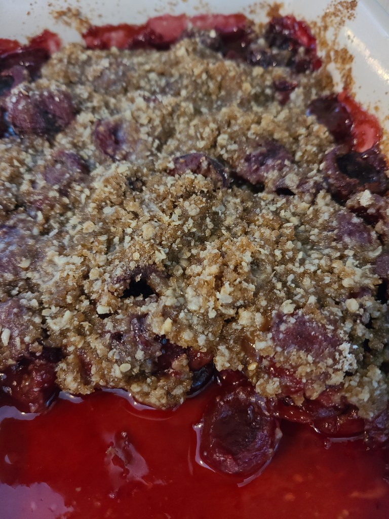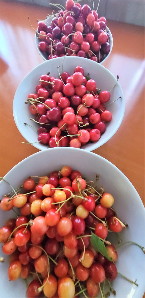 We, again not so much a ‘we’ but a ‘he’, was up on the roof picking pie and Rainier/Bing cherries. It is always a race to pick them ripe enough to eat off the tree before the birds get to them and this year we got a few grocery bags full. We do try to honor Uncle Billy who said the birds were here first so should be able to eat them, but they aren’t getting them ALL! I filled prebaked tart shells with a mix of cream cheese, lemon juice and a little Stevia then topped with pie cherries and made a crisp with the Rainier/Bing cherries. These were great summer desserts.