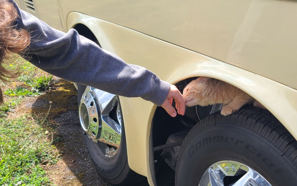 I love having a new view out the back window of the 1975 GMC Eleganza 2. Our stay at the Green Apple Alpaca Farm in Auburn Washington was a fantastic place to stay. It was easy to back our 26 feet long rv into the marked Harvest Host parking spot and the air bags made it very easy to level. Our hosts were there to meet us and make sure we were comfortable. It’s always fun to show someone the inside of our girl, it’s such a contrast from the outside. With the new antennae’s on top, it really resembles the EM-50 Urban Assault Vehicle.