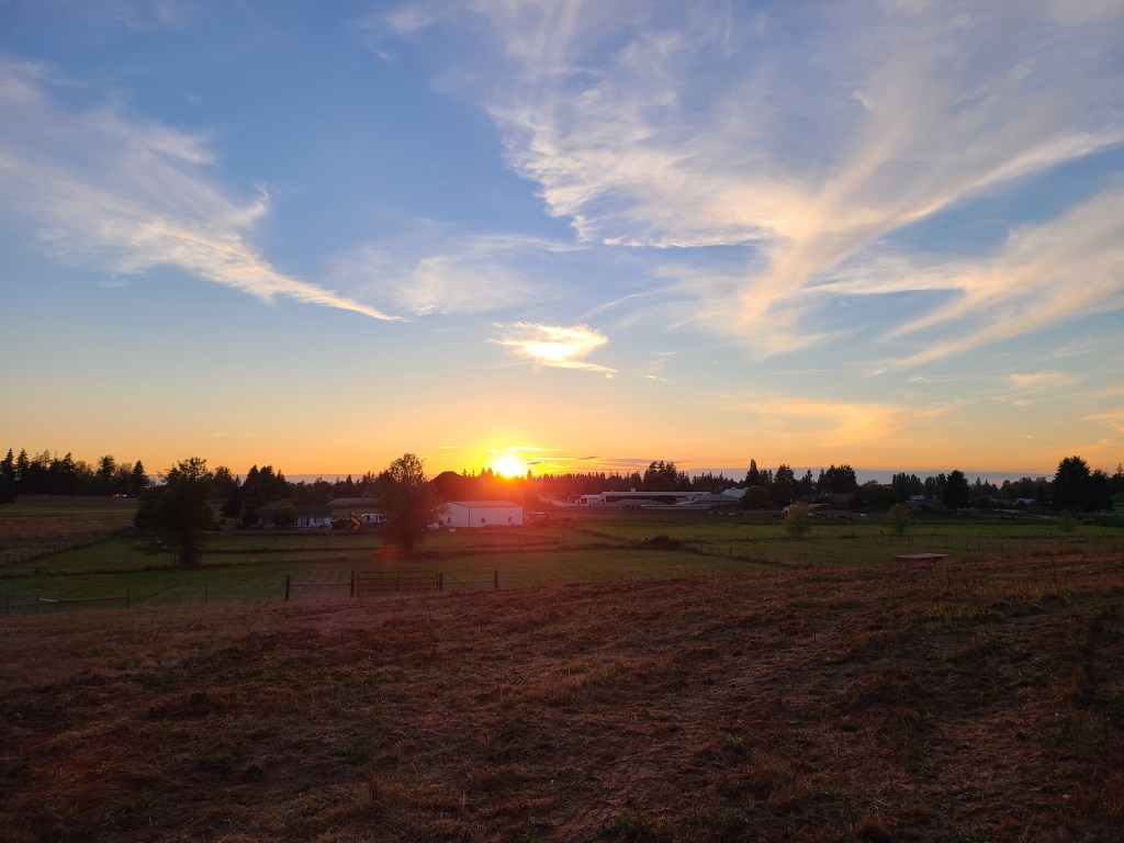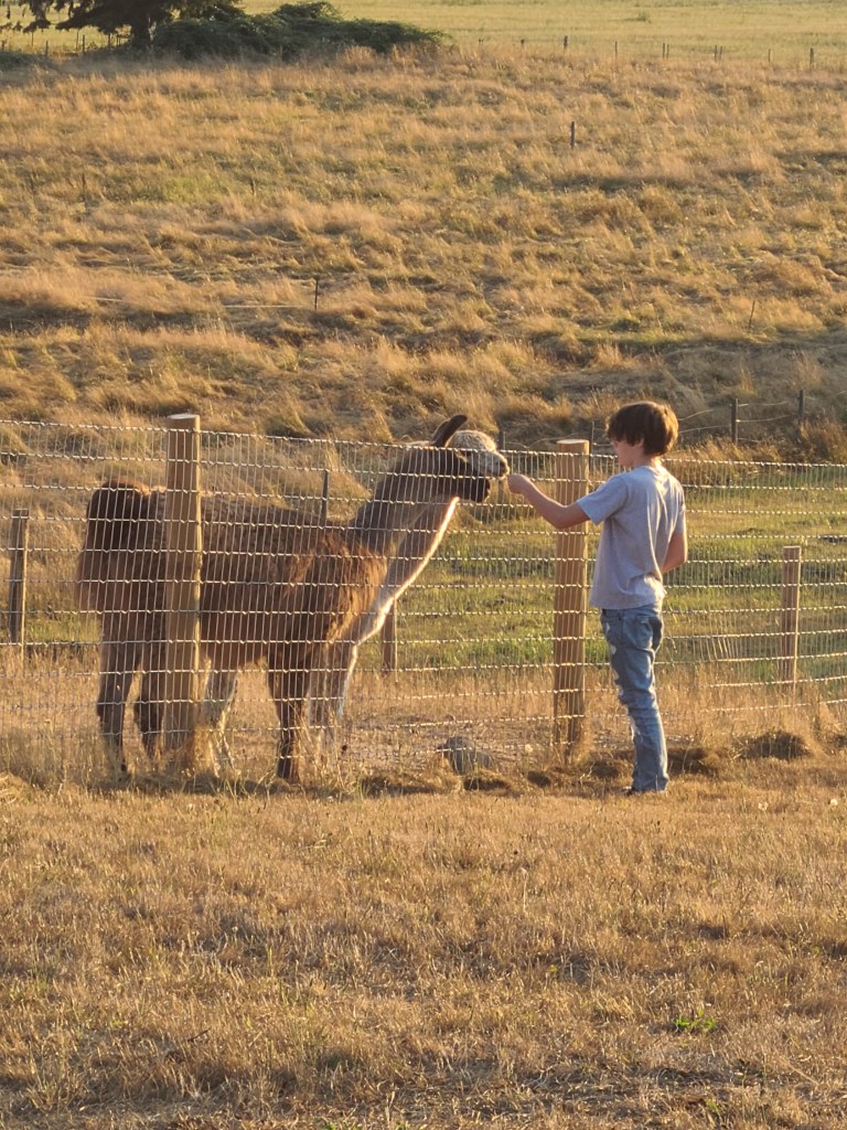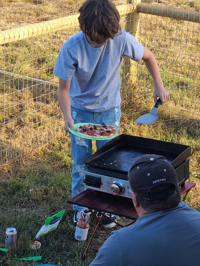 He enjoyed feeding the farm animals and then helped set up the Blackstone Grill on our small portable table before he made our pizzas for dinner. After dinner we set up our chairs in the open field and fed the animals blackberry leaves. We could see the neighboring dairy farm and the huge (70 feet high) pile of….. well….. ‘compost’ from the cows! We watched a powered paraglider fly past as the sun was beginning to set. I didn’t want to pack up the chairs and head back to our parking spot because I could have stayed out there all night, but I didn’t trust myself to walk on the pasture in the dark without twisting an ankle! We set up our chairs and stargazed for hours. ‘Grandma really likes stars I guess’ . He was a good sport – no video games, no phone…. just grandma, grandpa, the dog and acres of land to walk around with farm animals!