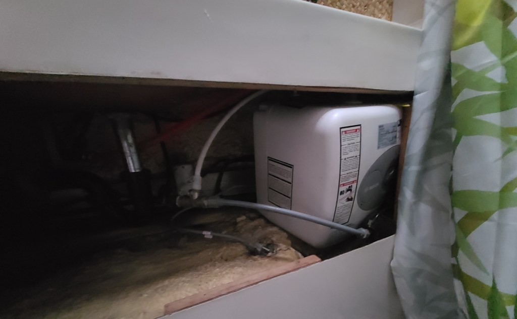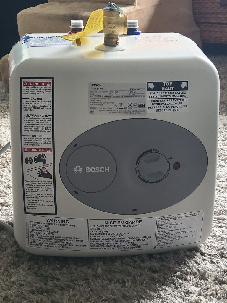 We had decided to replace our tankless hot water heater with a hot water tank. We couldn’t ever get it to work just right, it was either scalding or too cold. After a lot of monkeying around with it, we knew it would be money well spent to get a small tank. We decided on the Bosch Electric Mini Water Tank. It is a four gallon tank and fits where the original tank was installed – in the bathroom cabinet under the sink. The convenience of removing the Airhead composting toilet is an added advantage, gives you more leg space in that small wet bath.