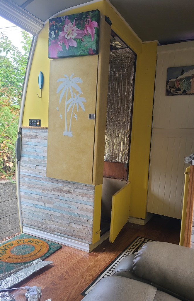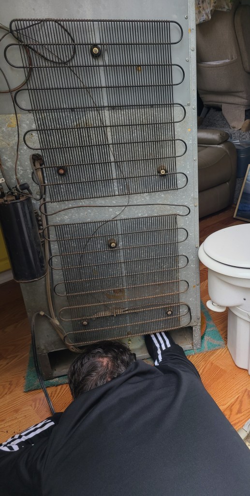 While we were replacing the hot water system, the refrigerator decided it was Done – yes, with a capital D! We aren’t sure if it was coincidence or we jolted it somehow but the original, nearly 50 year old fridge, has been retired. This started hours, well days, of research. While we would have liked to get a 12v/110 amp fridge, they seem to be in the same boat as many another items right now in the supply chain – it can be months before they will commit to having them in stock, let alone you getting one. With the solar system, battery system and generator we now have we decided to get a household refrigerator. At least our next few longer trips we will have electricity hook ups so we aren’t worried about the power draw and if we find it doesn’t work for us we will look again when things are back in stock.