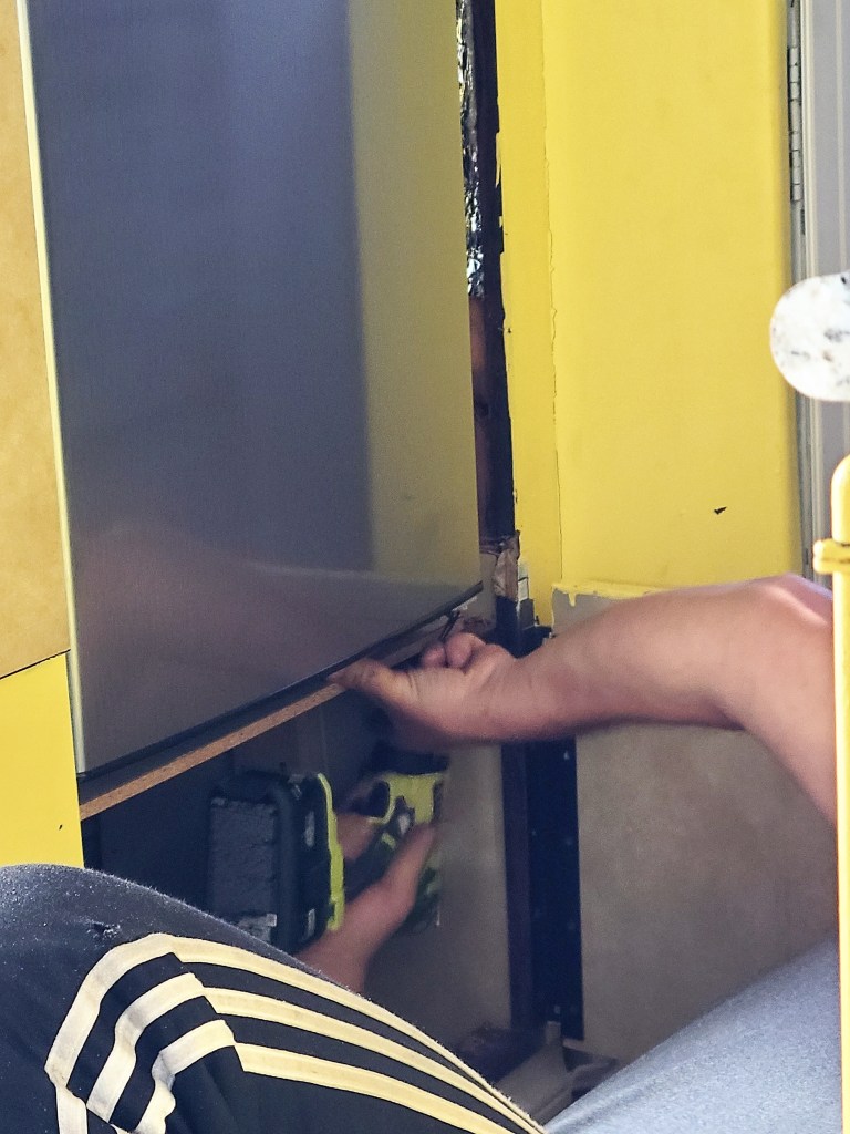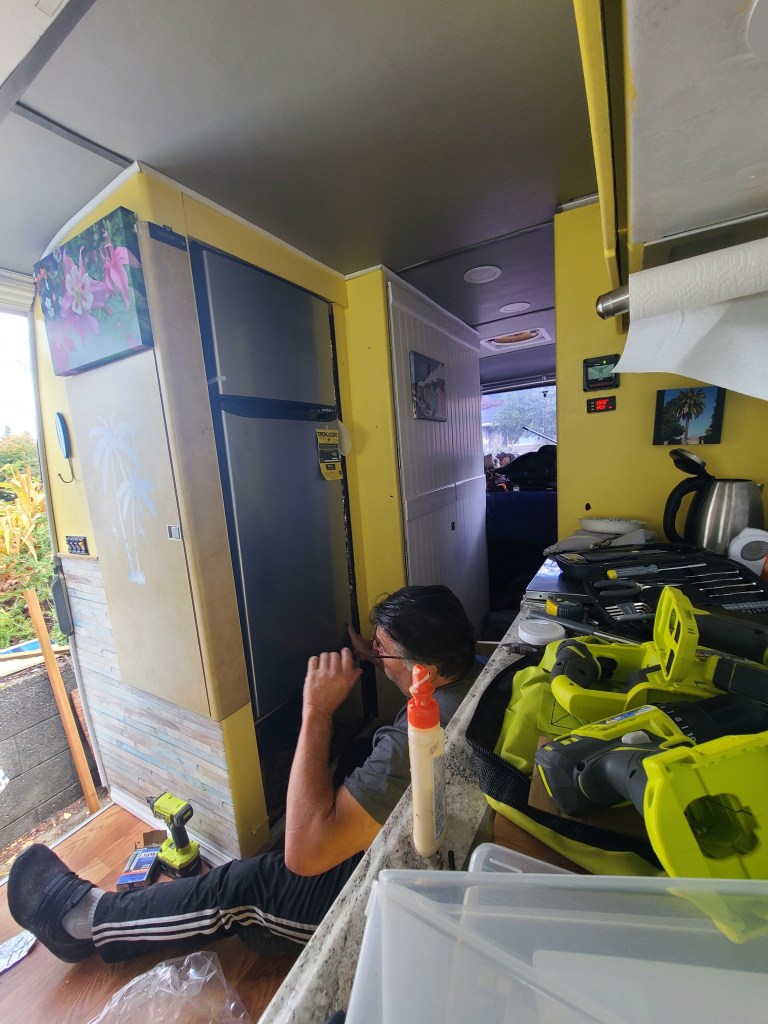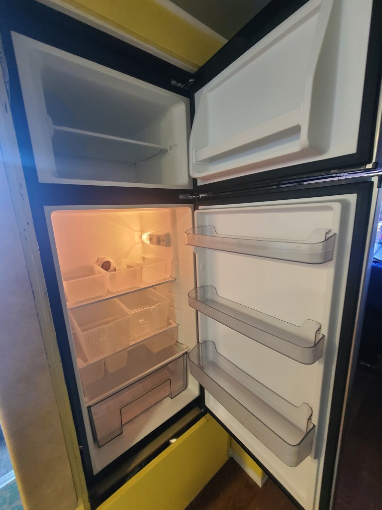 We bought the Homelabs 7.6 cubic feet residential refrigerator with freezer. With our lithium battery set up, solar power system, new generator plus the ability to plug into a power source at a campsite if they have it, we feel good about having this residential refrigerator. We rebuilt the floor the fridge sits on and once we had it in where we wanted we thoroughly braced it. We lined the vent door with waterproof weather striping to protect it from cold and hot weather and we have foam on order to frame it in snugly to keep air that could come through into the living area.