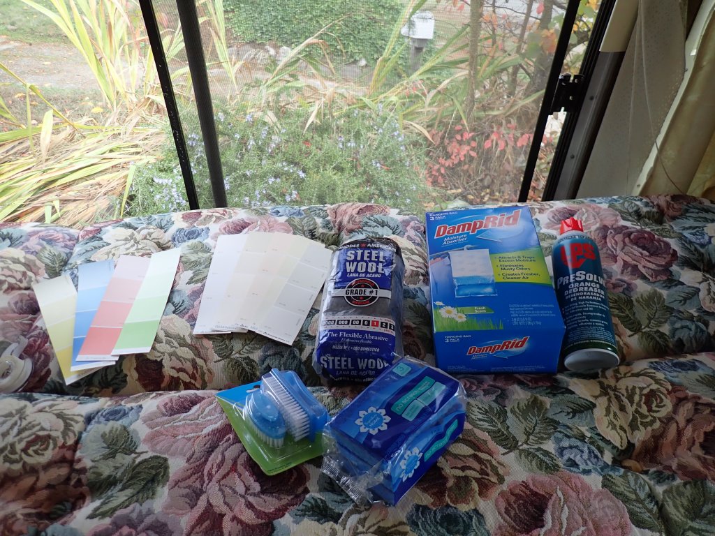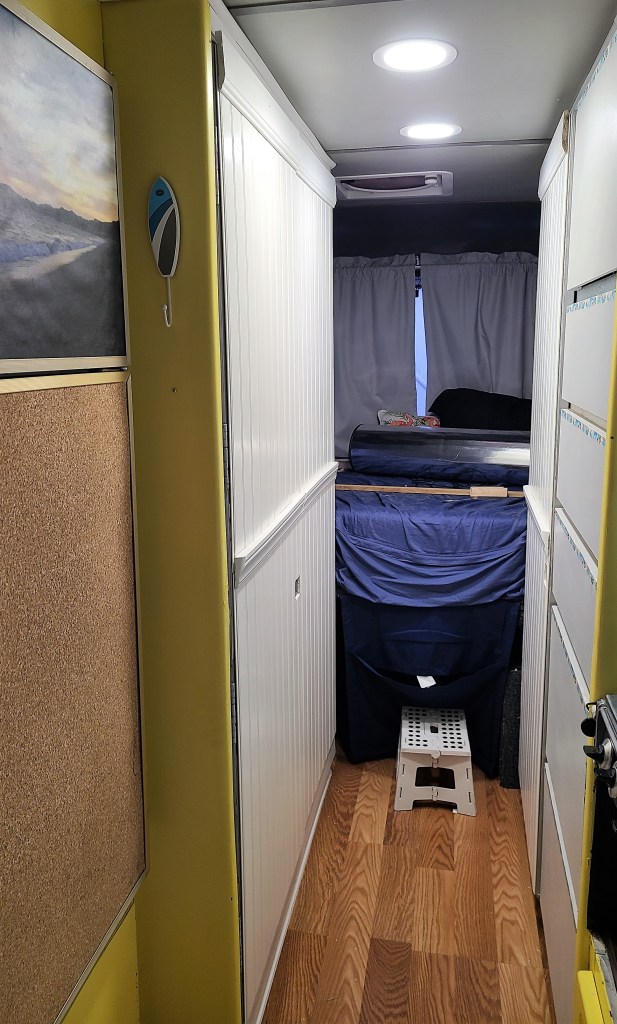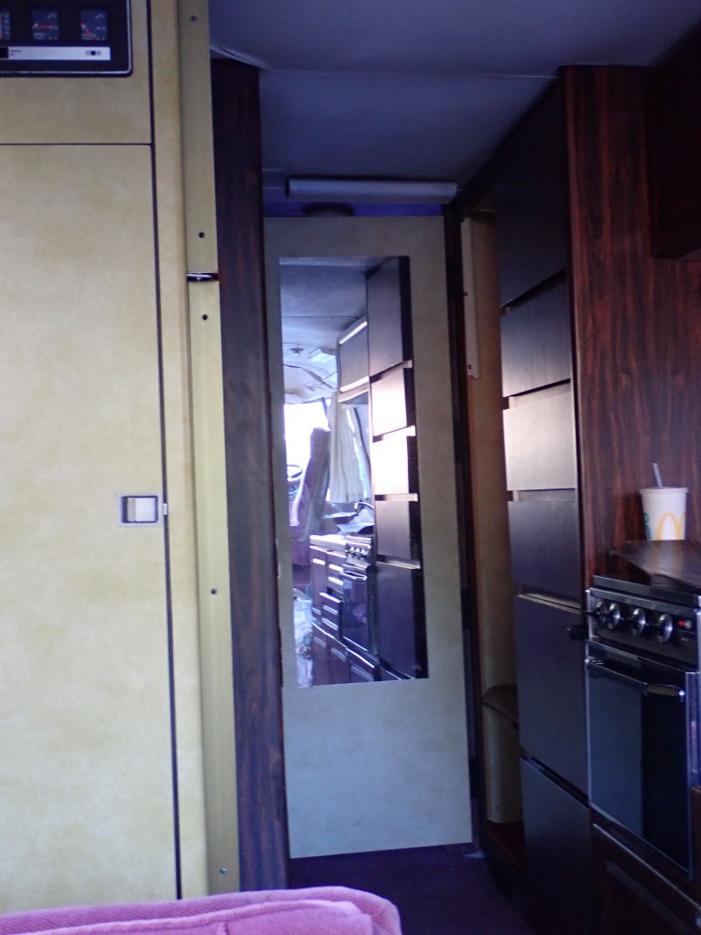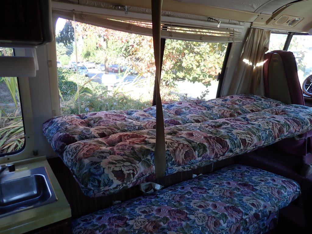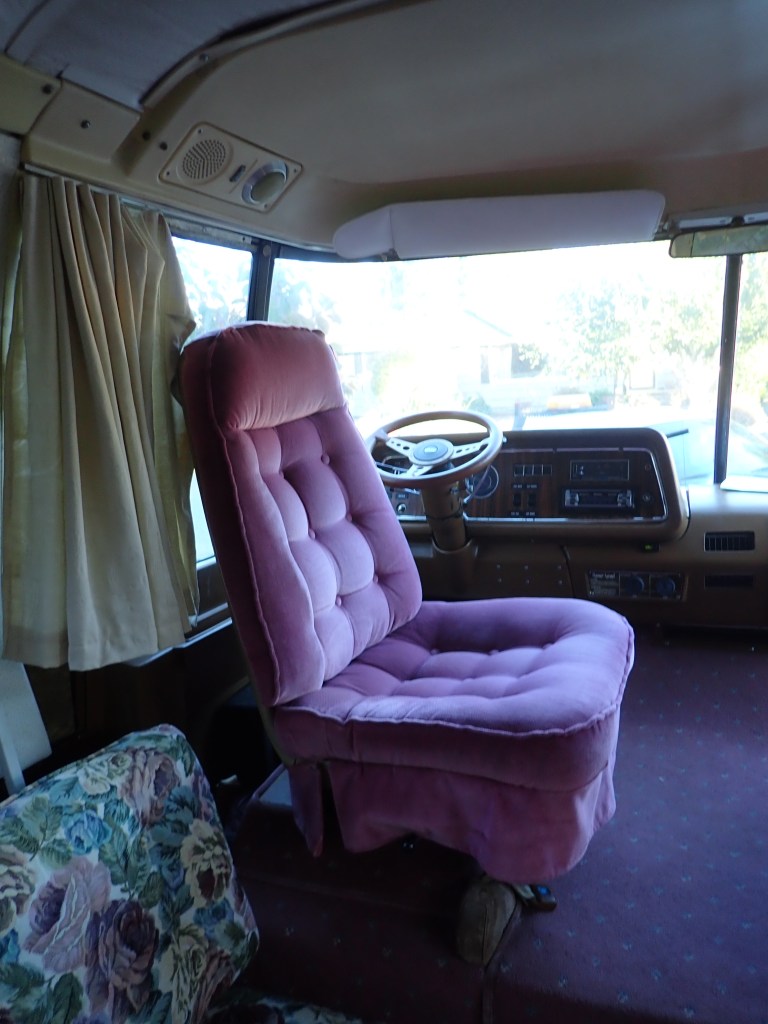 Though we had a number of model’s we were looking at, the GMC fit the driveway (!) and the unique body style appealed to us. When we went to check out this 1975 GMC Eleganza 2 there was a lot of floor stomping and pushing on walls for soft spots, sniffing for mold, opening drawers and closets looking for any surprises – we had watched a number of videos on buying a used RV and what to look for at least on the surface. Everything was as it should be and the engine started right up and ran well. The next thing we knew, we were driving it home!