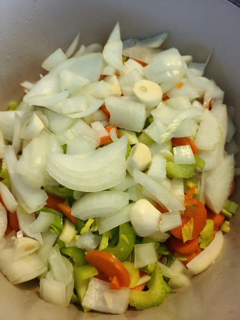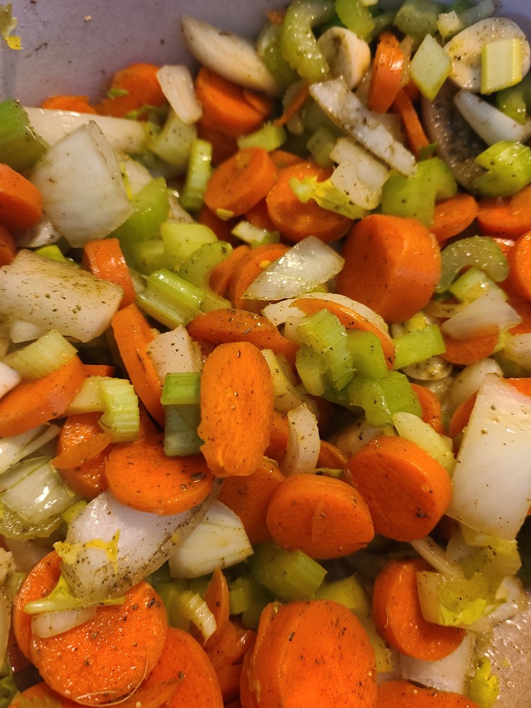 While we are planning a laid back day with music trivia and a movie, I still had to make my stuffing. I sautéed celery, sweet onions, carrots and garlic heavily seasoned with poultry seasoning until everything was soft.