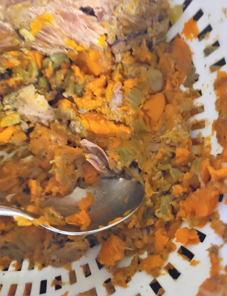 It may be easier with an emulsion blender (ahem….hint) but once everything is cooked through I mush it through the colander into a bowl to keep the yummies to go into the stock for the stuffing and a gravy base.