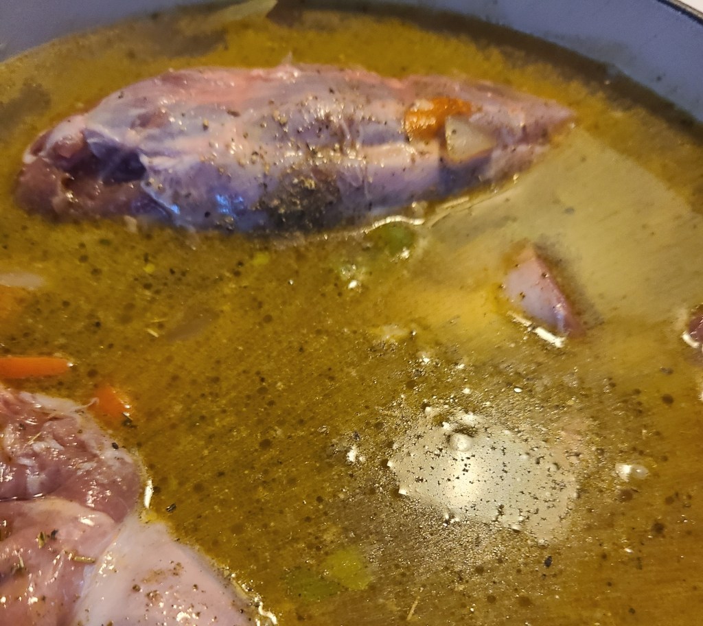 I add water and turkey necks and giblets with salt and pepper and more poultry seasoning and let it simmer for hours.