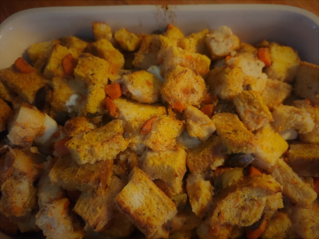 This year I sliced a loaf of sourdough bread and dried it in the oven before mixing it with the giblets, turkey stock, two eggs, more poultry seasoning, a dash of salt and pepper and baking it for 30 minutes. When it came out of the oven I scattered butter over the top, because everything is better with butter.