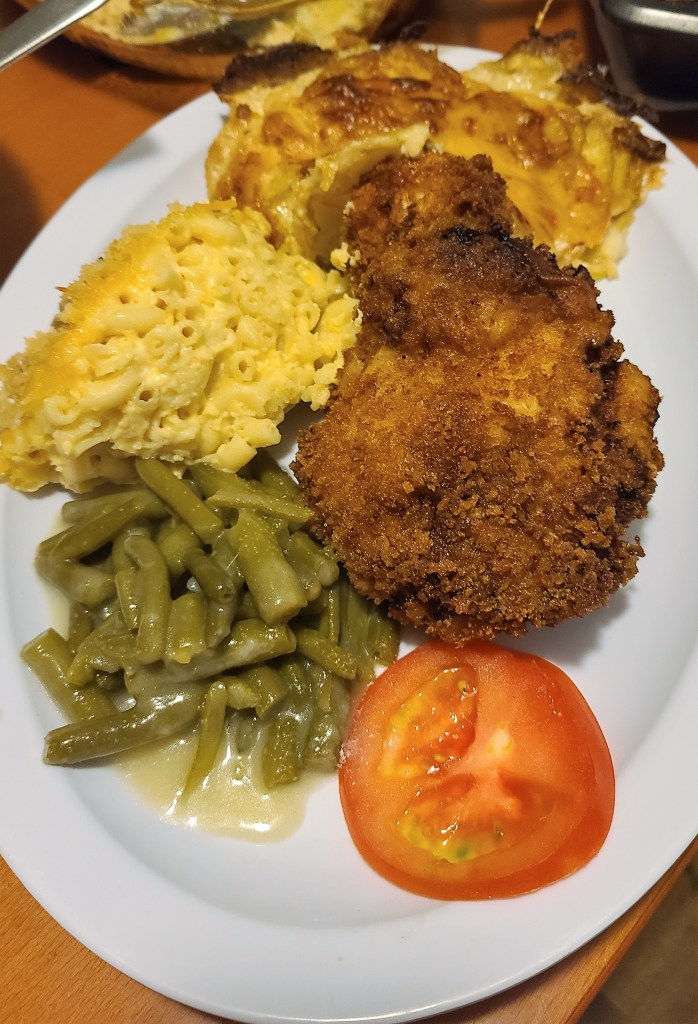 Grandma would cream green beans for our vegetable – I am using canned green beans with the liquid and stir in equal parts of butter and flour, stirring until it is a creamy skillet of goodness. It was definitely not a one pot meal so there are a ton of dishes to wash but it was well worth it.