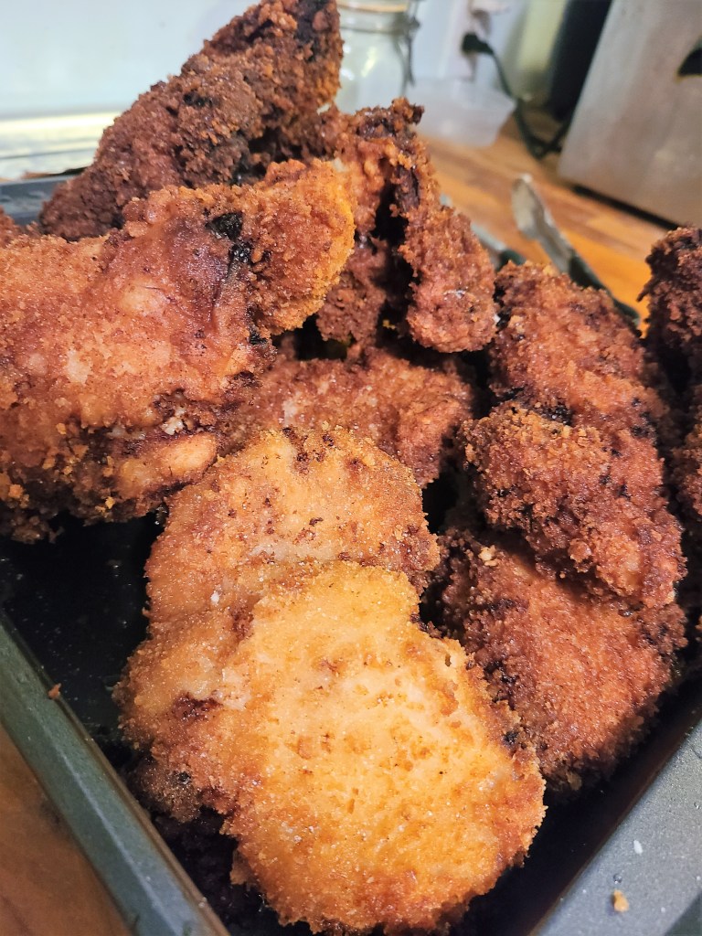 Last week I cleaned out my countertop deep fryer and put in new peanut oil to fry our chicken thighs in. When we were on a road trip from Miami to Brooklyn we stopped for lunch at Martha Lou’s Kitchen in Charleston, South Carolina. We were able to sit with Miss Martha Lou and we talked about how she used peanut oil to fry her chicken and I’ve been using it ever since. I’ve been brining the thighs in pickle juice for about eight hours and will dredge them in flour, dip in buttermilk and then coat in Panko before frying. I love my digital instant read thermometer, it leaves no doubt that the chicken is cooked to 165 degrees.