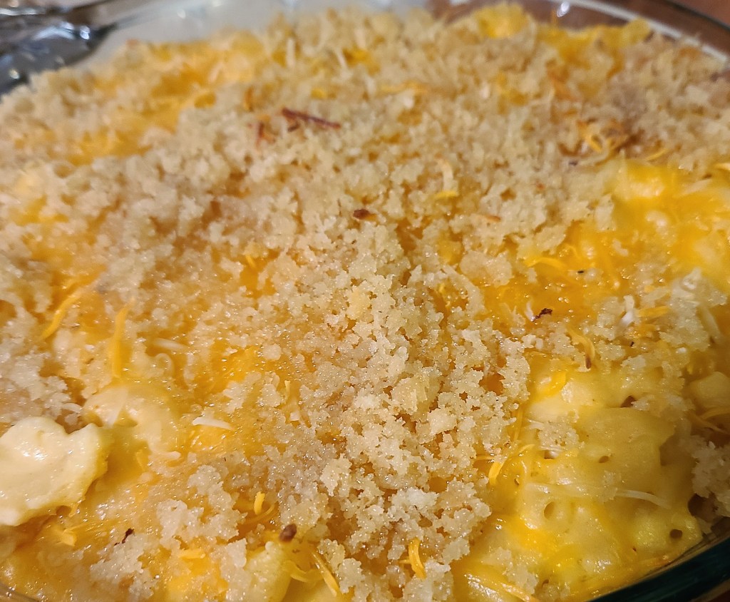 I made macaroni and cheese yesterday so all I have to do is warm it up tonight. I use small elbow macaroni and cook it for one minute less then the box suggests because it will continue to cook in the cheese sauce. Three tablespoons of butter melted and then three tablespoons of flour stirred in and cooked for 5 minutes before stirring in three cups of milk is the base. I slowly simmer this for ten minutes then temper in one egg and add a teaspoon of paprika and add salt and pepper and then stir in a couple handfuls of shredded cheese and fold in the macaroni. I will melt butter and add panko to cover the top and then bake in the oven to reheat so the top will be crispy and the inside gooey.