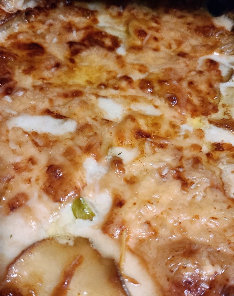 Thank goodness for the mandolin to slice potatoes and onions for Potatoes Au Gratin. I sautéed onion slices and leeks then added them to a large bowl with the sliced potatoes, two cups of cream and shredded (Italian blend) cheese before pouring it all into a greased baking dish. Topped the potatoes with shredded gruyere cheese and then popped in a 350 degree over for a little over an hour. I will cover with aluminum foil and reheat at the same time I heat the mac and cheese.