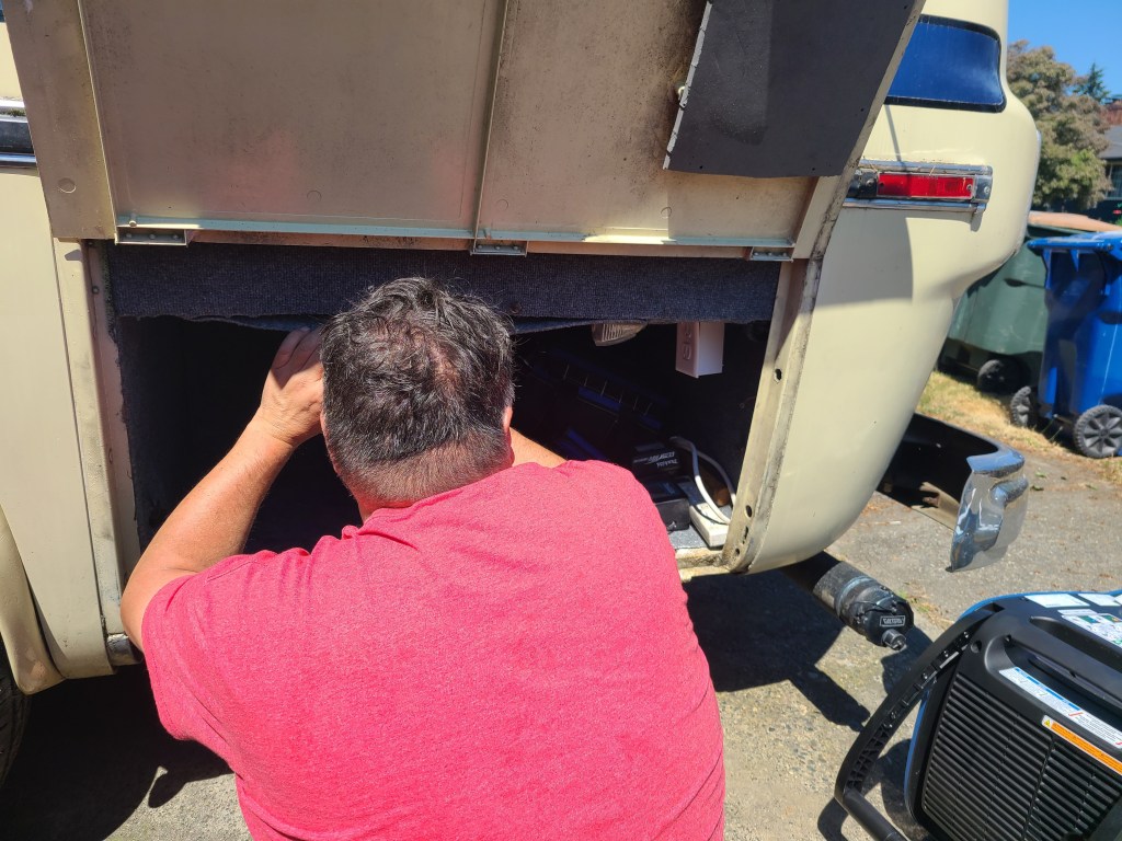 Since we bought the motorhome we have made a number of improvements and we have one more big project to tackle. The roof air conditioner is original to the Eleganza II, so it’s coming on 48 years. We are going to be proactive and put in a new air conditioning unit before the one we have retires itself. After removing the Onan generator we have a big space to put the condenser and the blower unit will fit nicely in a cupboard. We have created a storage area under the bed which we can modify (again!) to fit the condenser and will keep us from having what looks like a big white fan on the back bumper. That would work too but we’d prefer something more discrete.