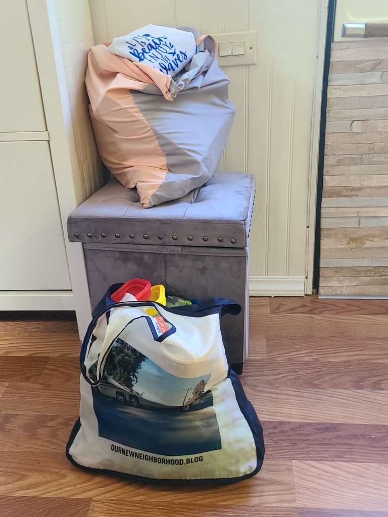 In preparation for an upcoming trip and the a/c install, it was time to go through the cupboards and closet and rethink some of the ‘essentials’. There are a few things that need to be washed but plenty that isn’t necessary. Plus I needed to bring the collapsible food storage containers in the house for meals I want to make before our trip and put in the freezer.