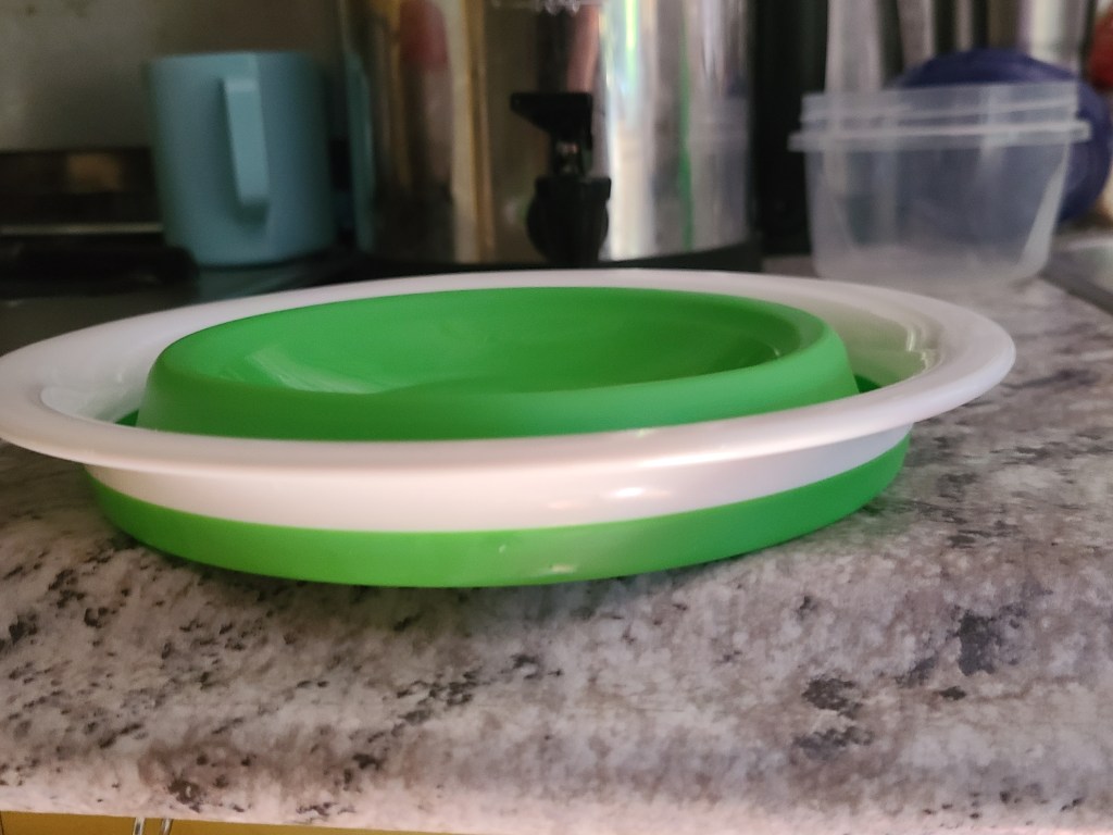 In a small space like the inside of the 1975 GMC Motorhome, every item needs to either be multipurpose or very compact. I almost forgot we had a collapsible strainer to rinse our blackberries in, it folds up so compactly I didn’t see it. I love the color of the bowls as much as I like the convenience of them! The blackberry muffins were great by the way!