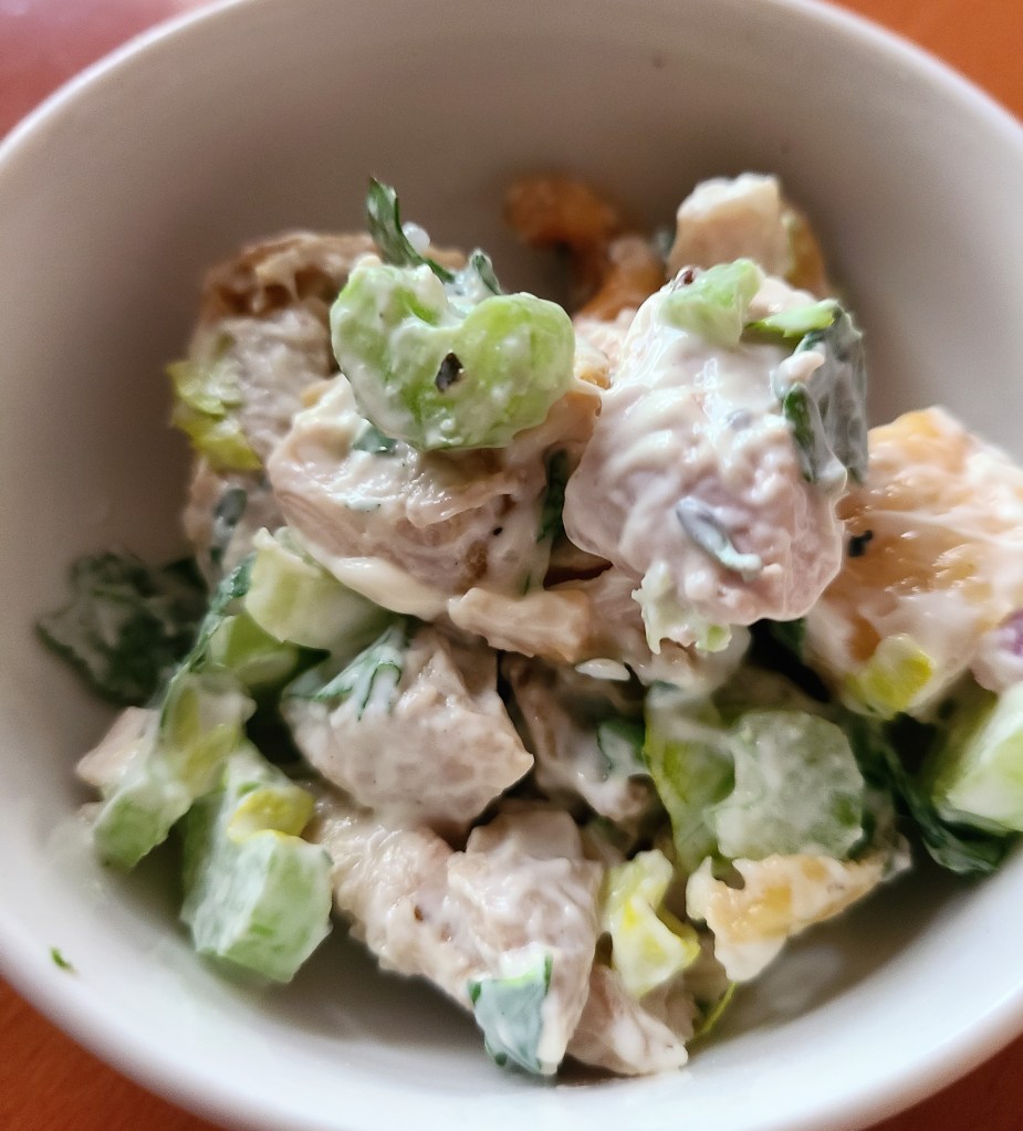 The gout in my toe has moments when it makes itself known so I am working on becoming ‘uric acid aware’ and am cutting back a bit on red meat. Cutting back, not eliminating – let’s make that crystal clear! I found a three bean salad recipe that I really enjoyed, though no one else was a fan so I’m pretty sick of it by now and it will be a while before I make it again! We bought a container of cashews at Costco which inspired me to make a cashew chicken salad. One of my favorite salads is Pea Salad. When I worked on Lower Queen Anne back in the mid 80’s to early 90’s I would visit a deli called Beba’s. Oh how I still miss that place! Besides the Rosannadanna Sandwich, the roast beef and havarti sandwich with alfalfa sprouts, a bagel with lox (all new tastes for me at that time in my life), the pea salad was one of my favorites. Peas, mayo, celery, bamboo shoots, bacon, cheddar cheese, dill, salt, pepper – oh my gosh. This is one salad I am glad no one else likes!
