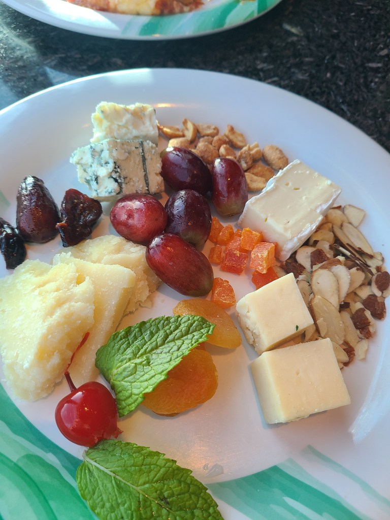 On our most recent Princess cruise, we were able to pick a variety of cheeses and take the plate to our room for a snack on our balcony. There are movies under the stars in the evening and it’s nice to have a meat and cheese platter instead of, or in addition to, the popcorn and chocolate chip cookies and milk they offer. We agree, the maraschino cherry and mint leaves were an interesting plate décor choice for our cheese plate!