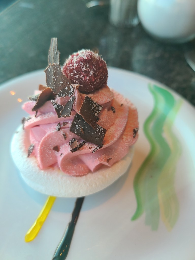 How about a bagel with smoked salmon and capers, sans bagel and cream cheese, for breakfast? Or steak tartare with a toast point for an evening snack? There are so many desserts, fresh baked cookies, pies, fruit, tarts and this lovely cherry filled meringue cloud.