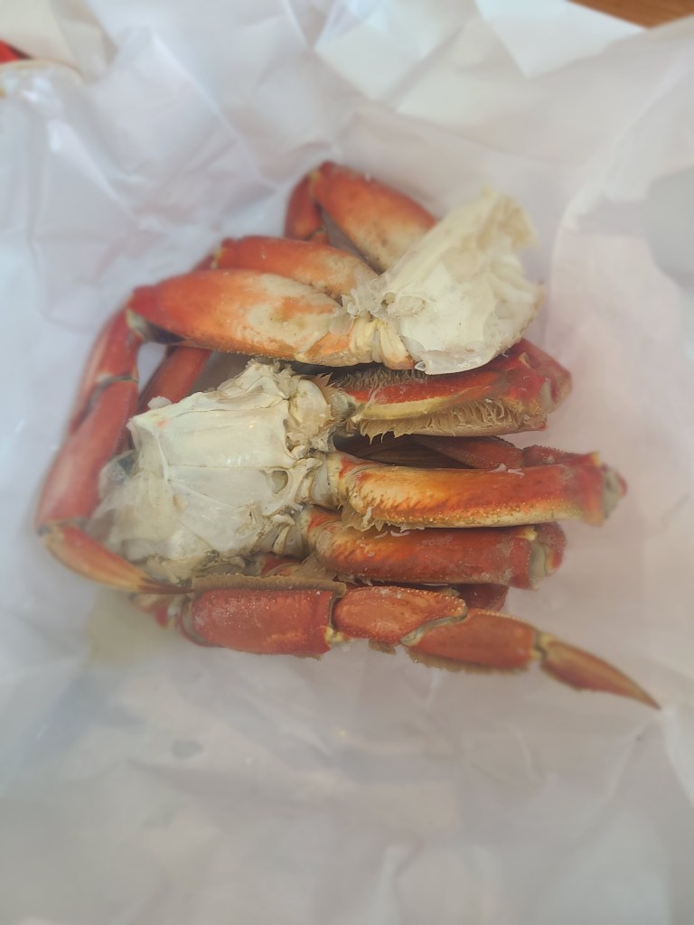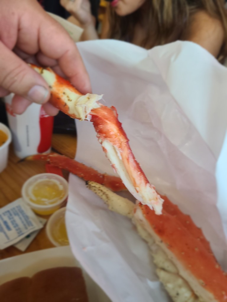 We splurged for lunch at Tracy’s Crab Shack right on the pier. As Pacific Northwesterners, we love our dungeness crab and it was as good here as we catch ourselves at home. The Red King Crab was tasty also – of course everything is delicious when it’s dipped in melted butter. The crab cakes were okay and the bisque was fine, but the crab was worth the price – well, if you were buying for two and not six!