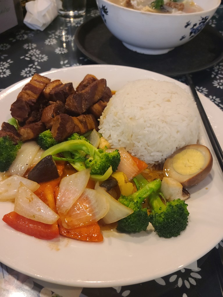 Victoria, BC is a beautiful destination. We walked from the cruise terminal to Government Street where we did a little shopping – chocolates at Rogers’ and maple syrup of course. We stopped at the pharmacy to get extra strength tylenol to take home and then to Chinatown for lunch at Little Yunnan. Victoria’s has the oldest Chinatown in Canada and we had been looking forward to visiting. We had the Crossing the Bridge Noodles* and a side dish of stewed pork belly with rice and vegetables. The noodle dish is similar to a hot pot but is based on this story – begins with a scholar who was studying hard for his imperial exams on a small island. His wife, who would bring him food, found that by the time she had crossed the bridge to the island the soup would be cold and the noodles were soggy. She then decided to load a large earthen pot with boiling broth with a layer of oil on top that would act as insulation and keep the broth warm. The noodles and other ingredients were kept in a separate container, and when she arrived, she mixed the two containers together for a warm soup. We would go back and have this again and are actually looking for a place close to home where we could go to have it.